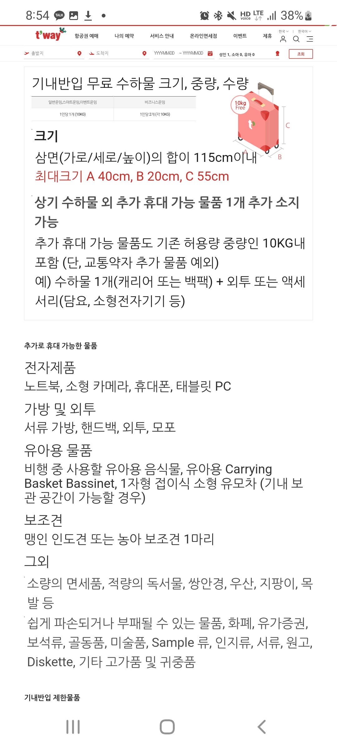 위와 같은 상황의 경우 수하물을 부치지 않고 기내에 들고 타는 방법을 고려해 볼 수도 있습니다. 저의 경우 들고타면 안되는 물품은 없었지만 캐리어의 크기가 규정보다 커서 기내 수하물로 들고 탈 수 없었습니다.